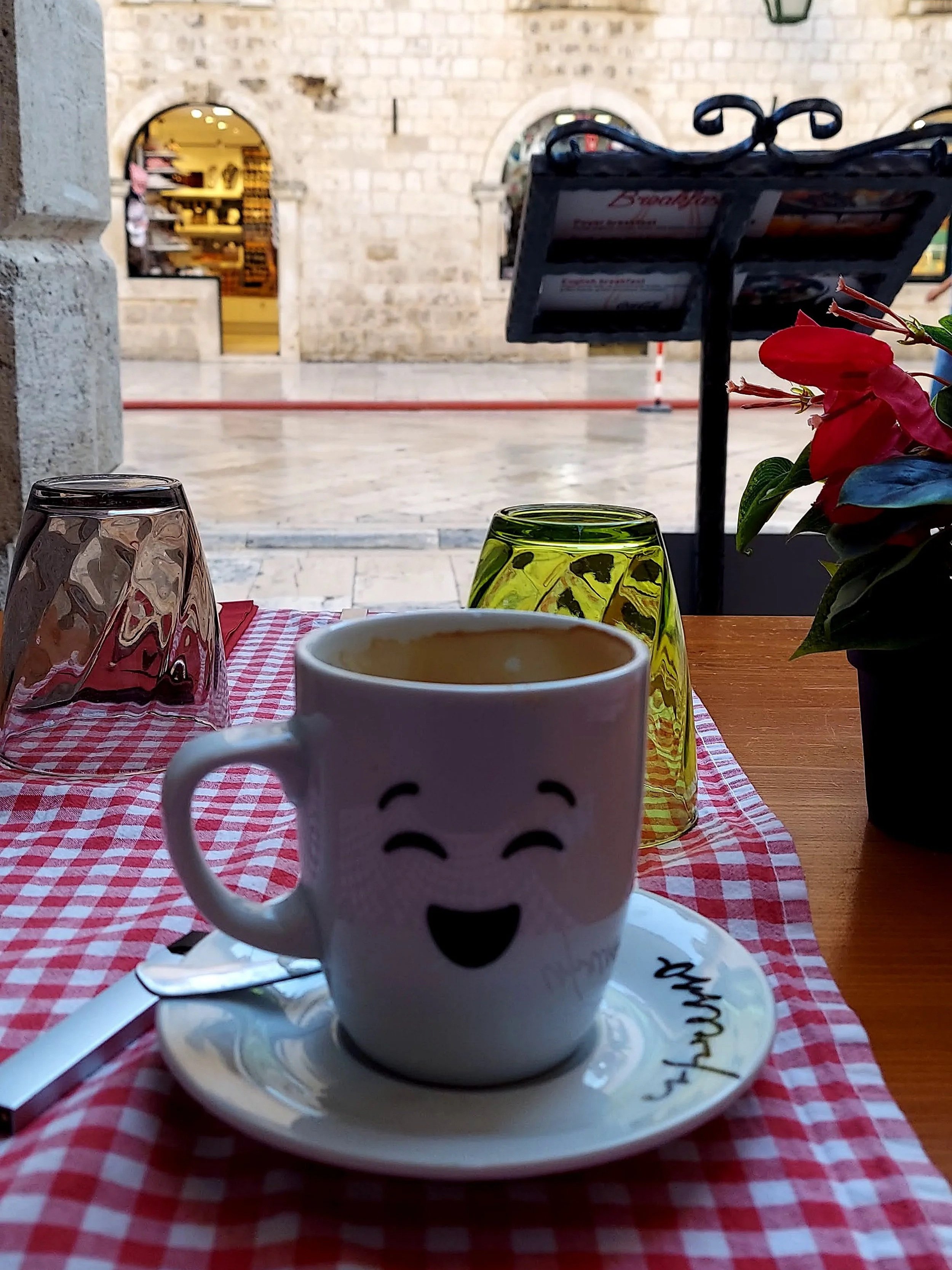 Dubrovnik, Croatia cafe on the main pedistrian walk. A smiling cup filled with a cafe latte.